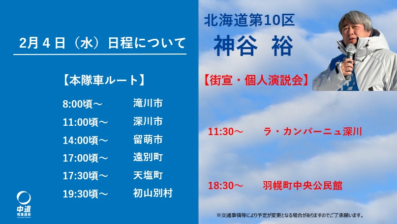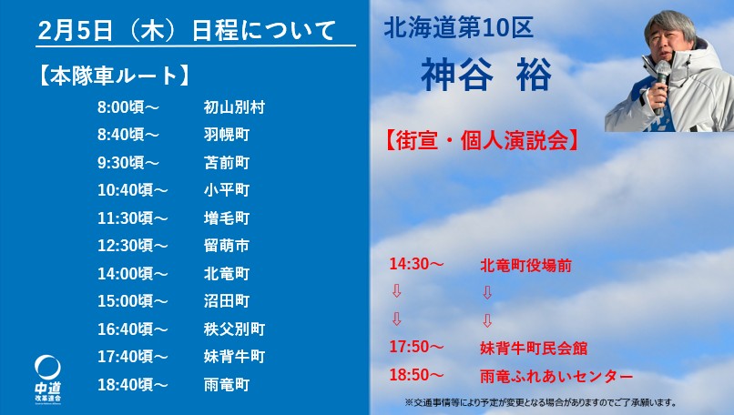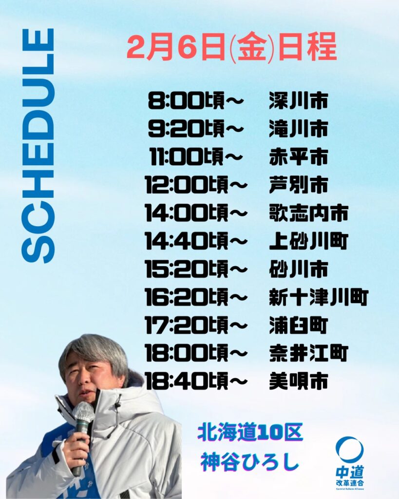 明日2月6日(金)の日程です。なお、時間・場所等は変更となる場合がございますのであらかじめご了承くださいますようお願いします。
