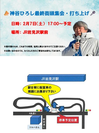 2026年2月6日 最終日2月7日(土)日程について お知らせ 最終日2月7日(土)の日程です。17:00よりJR岩見沢駅前にて最終街頭集会・打ち上げを行います。お誘いあわせのうえ、たくさんの方のご参加をお待ちしております。 なお、時間・場所等は変更となる場合がございますのであらかじめご了承くださいますようお願いします。