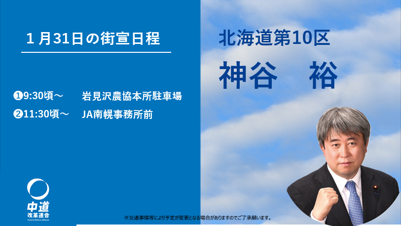 明日1月31日(土)の街頭演説日程です。なお、時間・場所等は変更となる場合がございますのであらかじめご了承くださいますようお願いします。