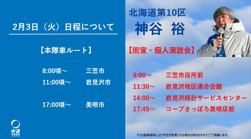 2026年2月2日 2/3(火)街宣・個人演説会日程 お知らせ 明日2月3日(火)の街宣・個人演説会日程です。なお、時間・場所等は変更となる場合がございますのであらかじめご了承くださいますようお願いします。